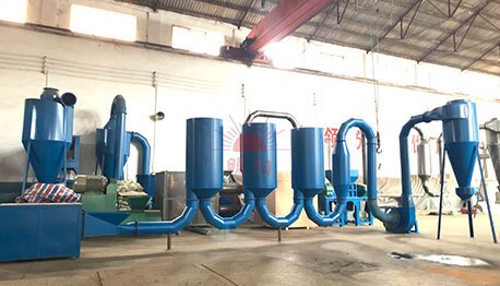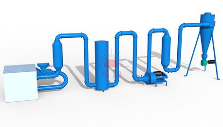 This dryer is suitable for drying materials of moisture 30~60%. The dryer is equipped with two fuel boilers, inlet, steel pipe, exhaust blower (fan), air lock and cyclone. Wet materials are put into the hopper.